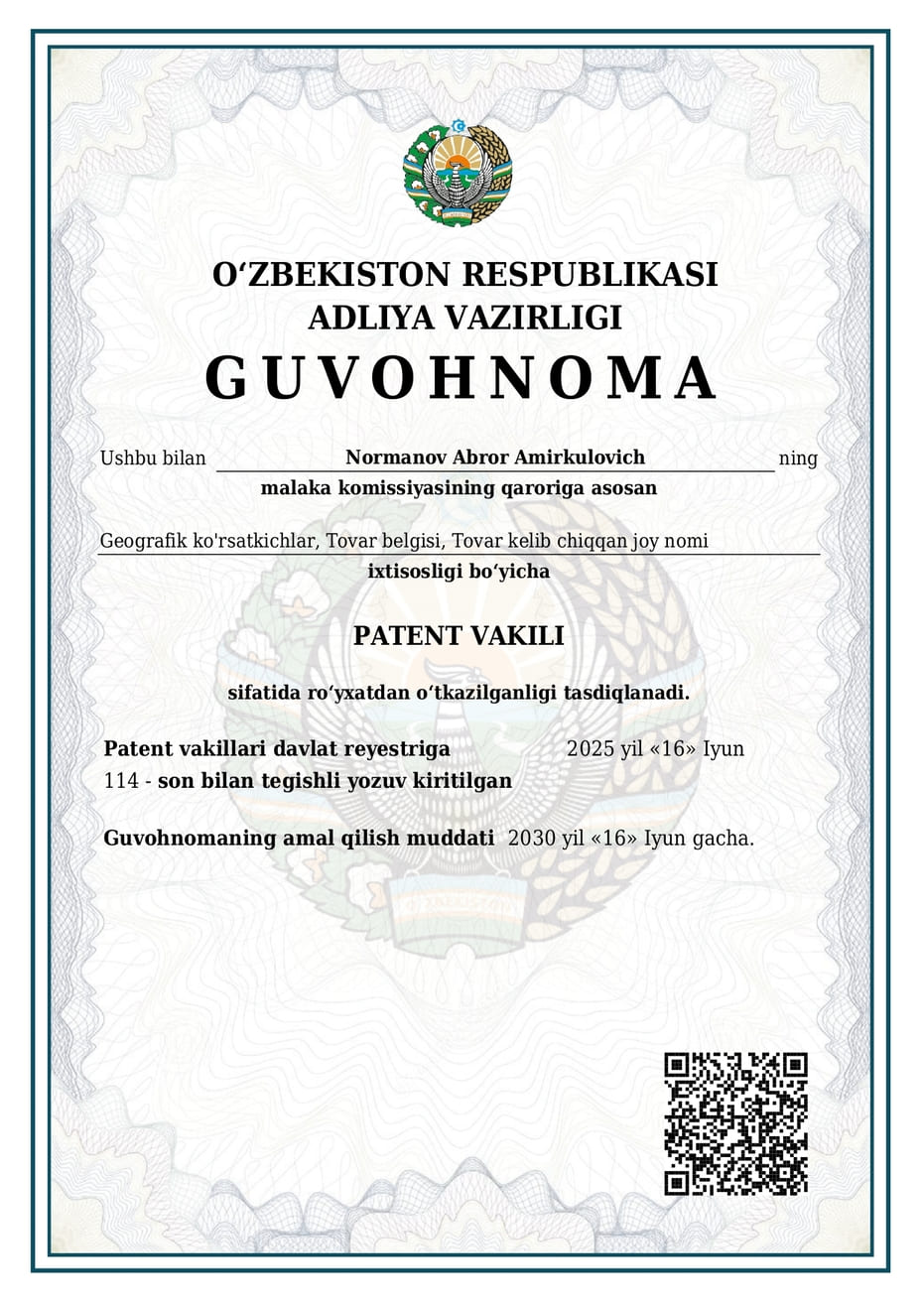 Запишитесь на консультация патентного адвоката — Аброр Амиркулович